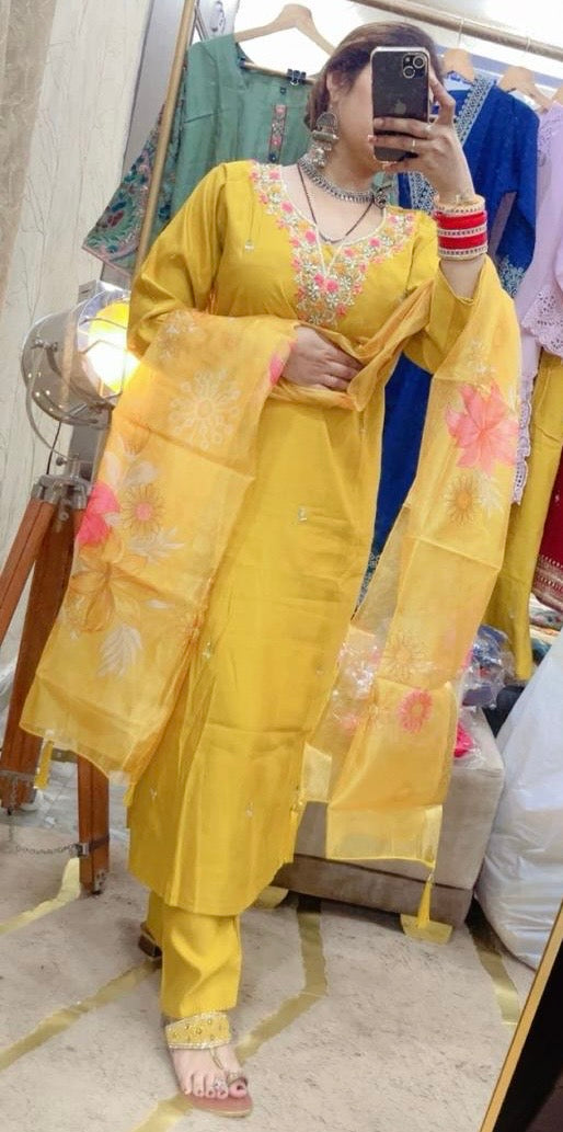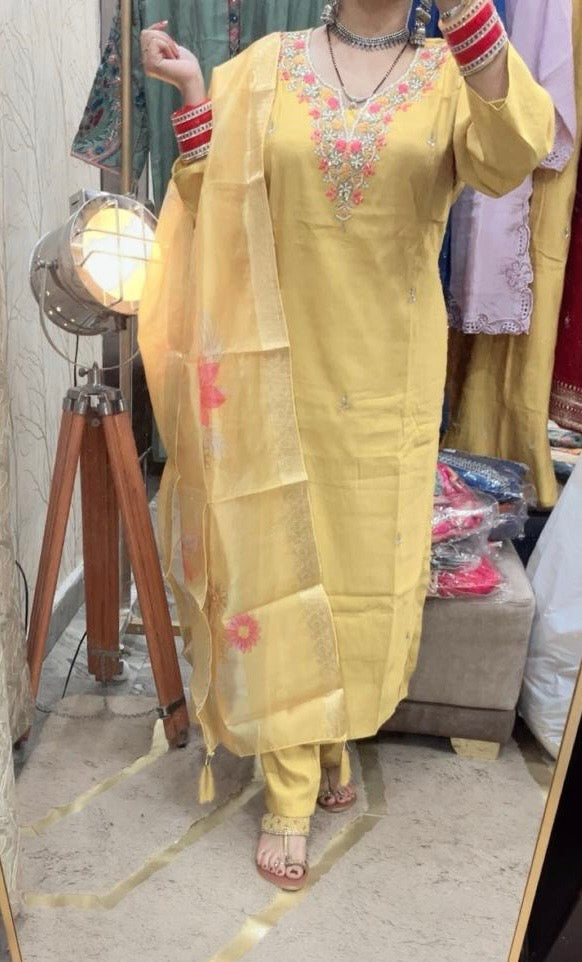 Orgenza yellow suit with hand work on neck with printed dupatta